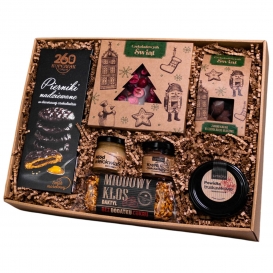 Świąteczny box prezentowy z popularnymi produktami. W zestawie znajdziemy pierniki, syrop, czekoladę, orzeszki, krem, miód oraz baton