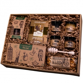 Pudełko prezentowe w formie box'a upominkowego z herbatą, różnego rodzaju miodami, powidłami, kremami miodowymi oraz piernikami.