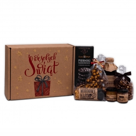 Świąteczny box prezentowy z popularnymi produktami. W zestawie znajdziemy pierniki, syrop, czekoladę, orzeszki, krem, miód oraz baton