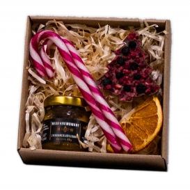 Świąteczny mały box prezentowy z czekoladką, laskami cukrowymi i miodkiem. Idealny na drobny upominek.