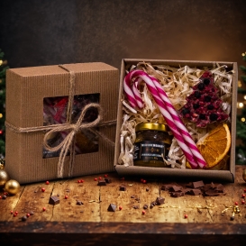 Box prezentowy na Święta. W zestawie znajdziemy dwie czekolady - mleczna i białą z dodatkami, laski cukrowe, powidła truskawkowe z miodem, krem czekoladowy z pyłkiem pszczelim oraz miód wielokwiatowy.
