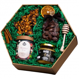 Pudełko prezentowe w formie box'a upominkowego z herbatą, różnego rodzaju miodami, powidłami, kremami miodowymi oraz piernikami.