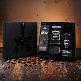 Elegancki box prezentowy dla niego. Kosz dla mężczyzny z pralinkami Lindt, czekoladą szwajcarską Goldkenn, miodem gryczanym i migdałami w czekoladzie od Chocolate Story.