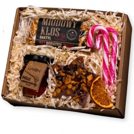 Mały box świąteczny z polski miodem wielokwiatowym, czekoladą z owocami, batonem z dodatkiem miodu oraz laskami cukrowymi.