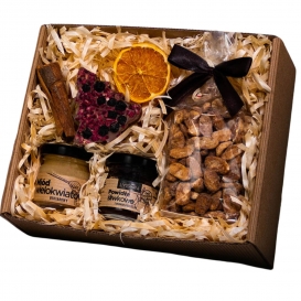 Pudełko prezentowe w formie box'a upominkowego z herbatą, różnego rodzaju miodami, powidłami, kremami miodowymi oraz piernikami.