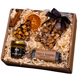 Tani zestaw prezentowy z miodkiem, truflą miodową, orzeszkami w miodzie i czekoladką.