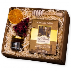 Pudełko prezentowe w formie box'a upominkowego z herbatą, różnego rodzaju miodami, powidłami, kremami miodowymi oraz piernikami.