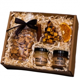 Kosz prezentowy w formie pudełka - box'a prezentowego. Idealny zestaw na podarowanie jako podziękowanie. W zestawie znajdziemy polskie naturalne miody, powidła, kremy, słodycze oraz świeczki z wezy pszczelej.