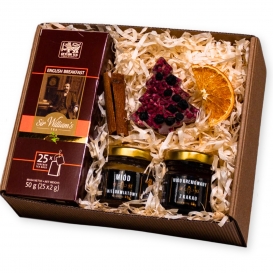 Pudełko prezentowe w formie box'a upominkowego z herbatą, różnego rodzaju miodami, powidłami, kremami miodowymi oraz piernikami.