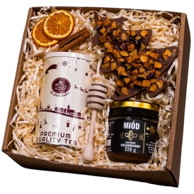 Box prezentowy na Święta Bożego Narodzenia. Znajdziemy w nim wysokiej jakości, zapakowaną w eleganckiej tubie herbatę zimową, polski miód wielokwiatowy oraz dużą czekoladę - choinkę z owocami.