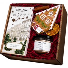 Świąteczny box prezentowy z wyszukanymi słodyczami od Wierzynka oraz ręcznie robionym piernikiem od Piernik Wrocławski.