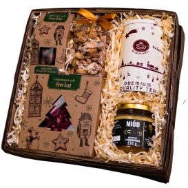 Duży zestaw prezentowy zapakowany w świąteczny kuferek. W zestawie znajdziemy praliny od Lindt, pierniki toruńskie od Kopernika, syrop do grzańca, miód z pomarańczą i goździkiem, bakalie w rumie, czekoladę oraz wyroby od Owsianej Manufaktury.