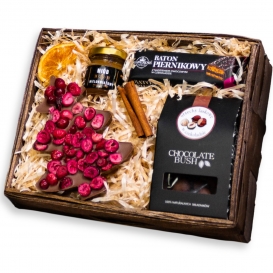 Świąteczny, mały kosz prezentowy z czekoladą - choinką z owocami liofilizowanymi, batonem piernikowym, orzechami w czekoladzie oraz miodkiem wielokwiatowym.