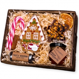 Swiąteczna paczka upominkowa w worku z rączką. W zestawie znajdziemy migdały w czekoladzie, piernik świąteczny, truflę miodową, czekoladę, miód oraz krem czekoladowy.
