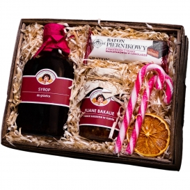 Pudełko prezentowe w formie box'a upominkowego z herbatą, różnego rodzaju miodami, powidłami, kremami miodowymi oraz piernikami.