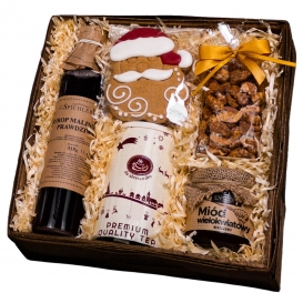 Świąteczny kosz upominkowy z syropem malinowym, przepięknym piernikiem w kształcie Mikołaja, herbatą zimową w eleganckiej tubie, orzechami nerkowca prażonymi z miodem oraz miodem wielokwiatowym.