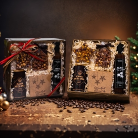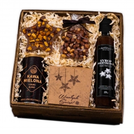 Box prezentowy z kawą typu instant od Little's, afrykańskimi orzeszkami i masłem orzechowym, czekoladą białą i mleczną z dodatkami, kremem czekoladowym z pyłkiem pszczelim, batonem miodowym oraz migdałami w czekoladzie.