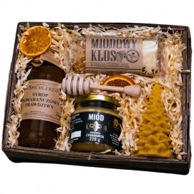 Pudełko prezentowe w formie box'a upominkowego z herbatą, różnego rodzaju miodami, powidłami, kremami miodowymi oraz piernikami.