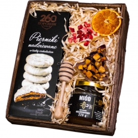 Pudełko prezentowe w formie box'a upominkowego z herbatą, różnego rodzaju miodami, powidłami, kremami miodowymi oraz piernikami.