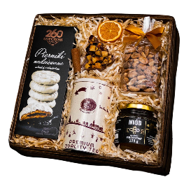 Pudełko prezentowe w formie box'a upominkowego z herbatą, różnego rodzaju miodami, powidłami, kremami miodowymi oraz piernikami.