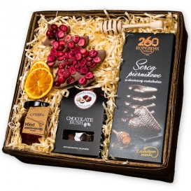 Pudełko prezentowe w formie box'a upominkowego z herbatą, różnego rodzaju miodami, powidłami, kremami miodowymi oraz piernikami.
