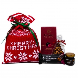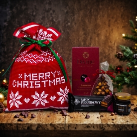 Świąteczny upominek w worku prezentowym. W zestawie znajdziemy baton piernikowy, żurawinę w czekoladzie, miód z kakao oraz czekoladę z dodatkami.