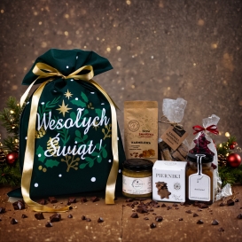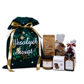 Zestaw prezentowy w worku świątecznym. W zestawie znajdziemy kawę smakową, miód z pomarańczą i goździkiem, krówki miodowe, pierniki, słony karmel oraz czekoladę z dodatkami.