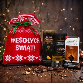 Świąteczny prezent zapakowany w worek upominkowy z napisem Wesołych Świąt. W zestawie znajdziemy: pierniki toruńskie, praliny z nadzieniem rumowym, czekoladę Lindt, skórki pomarańczowe w czekoladzie, baton piernikowy oraz miód kremowany.