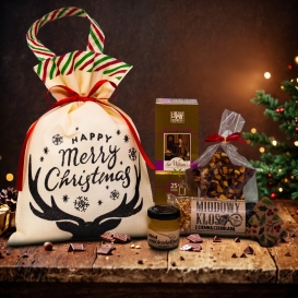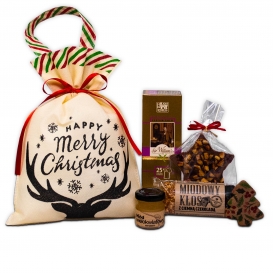 Swiąteczna paczka upominkowa w worku z rączką. W zestawie znajdziemy migdały w czekoladzie, piernik świąteczny, truflę miodową, czekoladę, miód oraz krem czekoladowy.