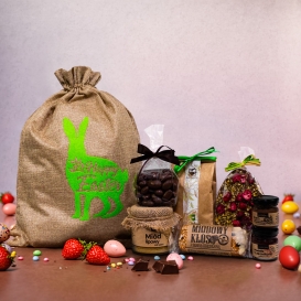 Wielkanocna paczka prezentowa z polskim miodem lipowym, przepiękną czekoladową pisanką, zdobiona liofilizowanymi owocami oraz pistacjami, herbatką, kremikiem, powidłami, batonem oraz migdałami oblanymi mleczną czekoladą.