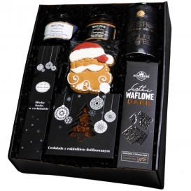 Box prezentowy z świąteczną grafiką. W zestawie znajdziemy: ciastka czekoladowe, syrop malinowy, konfiturę pomarańczową, orzeszki prażone w karmelu, baton miodowy, oraz czekoladę z dodatkami.