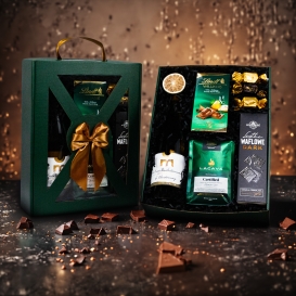 Box prezentowy na Święta Bożego Narodzenia. Znajdziemy w nim wysokiej jakości, zapakowaną w eleganckiej tubie herbatę zimową, polski miód wielokwiatowy oraz dużą czekoladę - choinkę z owocami.