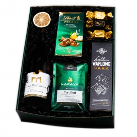 Elegancki box prezentowy dla niego. Kosz dla mężczyzny z pralinkami Lindt, czekoladą szwajcarską Goldkenn, miodem gryczanym i migdałami w czekoladzie od Chocolate Story.