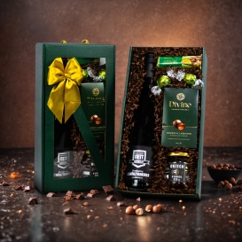 Elegancki box prezentowy dla niego. Kosz dla mężczyzny z pralinkami Lindt, czekoladą szwajcarską Goldkenn, miodem gryczanym i migdałami w czekoladzie od Chocolate Story.