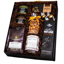 Elegancki zestaw prezentowy w pudełku z rączką. W zestawie znajdziemy wysokiej jakości kawę ziarnistą, kremy od Wierzynka, czekoladę pitną w eleganckiej tubie, krówki miodowe, prażone nerkowce z miodem oraz listki waflowe w deserowej czekoladzie.