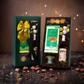 Elegancki box prezentowy dla niego. Kosz dla mężczyzny z pralinkami Lindt, czekoladą szwajcarską Goldkenn, miodem gryczanym i migdałami w czekoladzie od Chocolate Story.