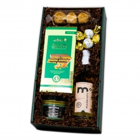 Elegancki, prawdziwie męski zestaw prezentowy w karbowanym pudełku prezentowym. Zestaw z czekoladą Goldkenn, kremem orzechowym od Wierzynka, Musztardą z zielonym pieprzem, oraz orzeszkami prażonymi z miodem.