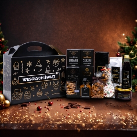 Duża paczka prezentowa w kuferku świątecznym. W zestawie znajdziemy produkty od Manufaktury wiśni - Cherry Gifts, Owsianej Manufaktury, klasyczne pierniki z Torunia i inne specjały.