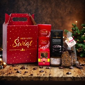 Elegancki box - kuferek prezentowy z rączką na Boże Narodzenie. W zestawie znajdziemy popularne słodycze od Lindt, herbatę malinową, pierniki toruńskie, miód piernikowy, orzeszki prażone z miodem oraz ciastka owsiane z Manufaktury z dodatkiem malin.